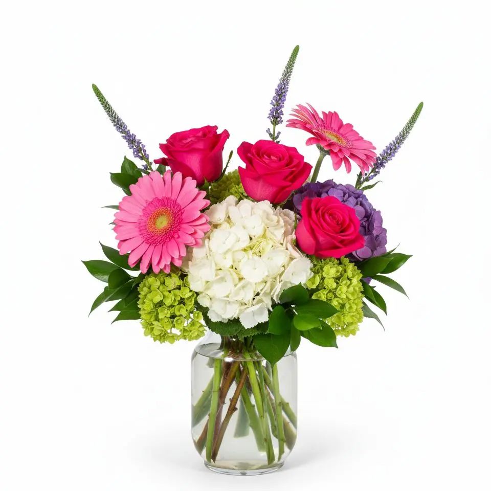 Experience the delicate beauty of our Blushing Hydrangea, a vibrant arrangement that brings joy to any space. Featuring a graceful mix of hydrangeas, pink roses, and gerbera daisies, this bouquet radiates warmth and charm. It's the perfect way to brighten someone's day or add a touch of elegance to your home.